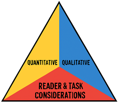 As a reminder, using a quantitative measure such as Lexile is part of the three-part model for measuring text complexity that includes quantitative and qualitative dimensions as well as reading and task considerations. Quantitative algorithms generally measure the surface level of texts: word length and frequency, sentence length and complexity of clauses, and overall repetition of key words and inclusion of transition words. This initial measure of text can be useful for getting an objective, initial idea of the surface demands of a text and can give us a rough idea of whether a text is within a range appropriate for a group of learners.