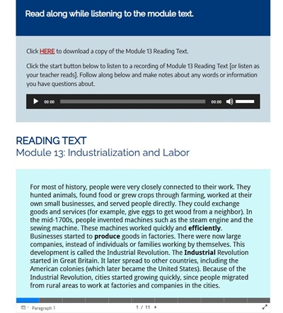 CILIA-T cultivates a classroom environment where adult learners can share and build on their immense personal experience as global citizens in partnership with their classmates. Learners find the U.S. history, civics and government content highly engaging and are provided continual opportunities to integrate their prior knowledge with new learning and everyday experiences in their communities. Students also appreciate the explicit academic English activities and technology skill application built systematically into each module.
